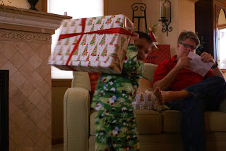 This year we had Christmas at my parents house in Loveland so we went straight from our overnighter in Denver up to their place. Christmas Eve was so fun. Tanner and J played on the four wheeler in the backyard and mom, Tessa and I enjoyed a 2.5 hour workout while Todd and Sammy hung out and watched football. That night we had a low key dinner and afterwards we had some friends come over and the kids acted out the Nativity. It was so cute! After our company had left for the night, the boys opened up their pj's and Jackson wrote a note to Santa (and Rudolph). Then we went out in the backyard and left some food for the reindeer (which is a mix of oats, marshmallows, pretzels and of course, glitter!). We tried to read a story, but Jackson was so worried that Santa wouldn't come if he wasn't in bed that minute that he missed out.